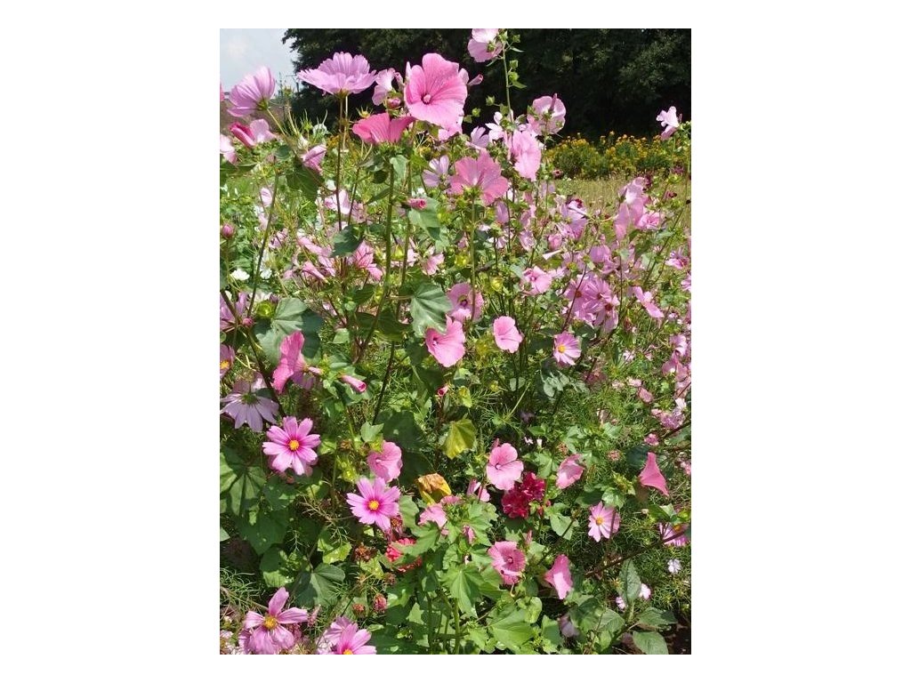 Nosné druhy letniček ve směsi: Centaurea (Chrpa), Lavatera (Slézovec), Zinnia (Ostálka), Cosmos (Krásenka)
