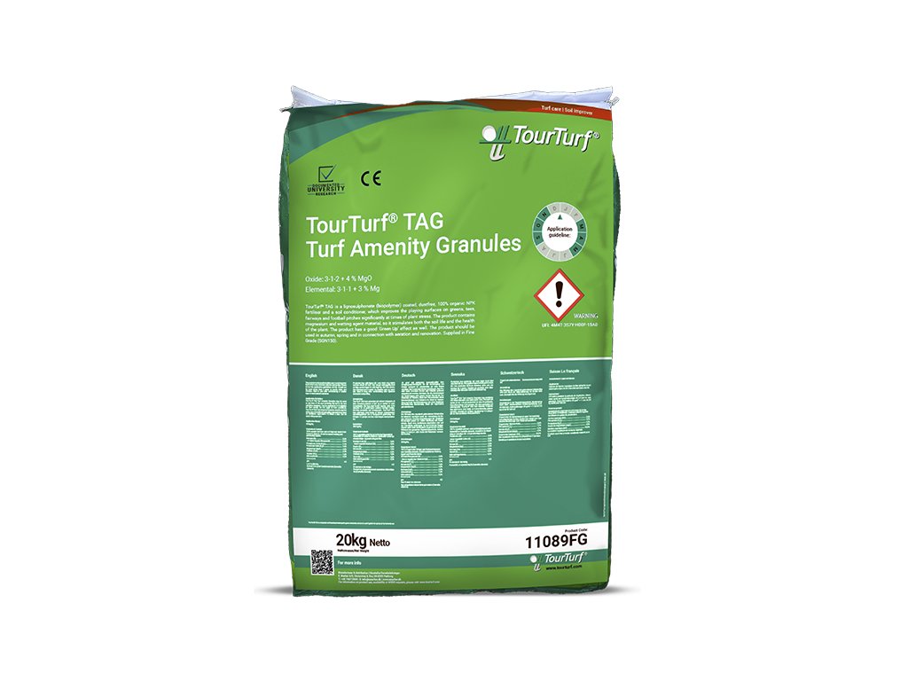 TourTurf® TAG je 100% organické NPK hnojivo a půdní kondicionér, které výrazně zlepšuje hrací plochy na greenech, odpalištích, fairwayích a fotbalových hřištích v obdobích stresu. Lze jej použít i na všechny typy dalších rekreačních travnatých ploch. Obsahuje hořčík a smáčecí látku, takže stimuluje půdu i rostlinu. Produkt má také dobrý efekt na rychlé "zazelenání".